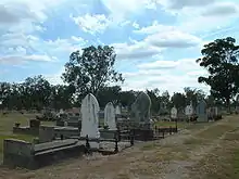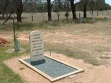 Despite his body being identified by police and a priest before being burnt, there have also been stories that both Dan and Steve survived the fire.[17] There is little evidence to support these claims.[18][19] One man, James Ryan, said he was Dan Kelly. In 1934 he went on stage at the Brisbane Exhibition and told stories about the Kelly Gang. He died on 29 July 1948, after being struck by a train.[20] The Ipswich City Council have put a memorial on his grave. In 2001, scientists took a small piece of bone from the grave of Charles Devine Tindall at Toowoomba, Queensland, to see if they could find DNA to prove he was Dan Kelly.[21] Devine, who had burn scars on his body, told his family he was really Dan.[22] He said he had hidden under the floor of the Glenrowan hotel and escaped after the fire.[21] An archaeological dig at the site of the hotel by Adam Ford in 2008 found that there was no cellar or other hiding place under the floors.[23] In October 1902, a Melbourne newspaper printed a story that Dan Kelly and Steve Hart were living in South Africa.[24] The men had fought in the Boer War. Another man, Jim Davis from Darra (a suburb of Brisbane, Queensland), said in 1938 that he was Dan Kelly. He claimed that he, Steve Hart and Joe Byrne had escaped from the hotel.[25] He also said he was born at the Eureka Stockade in 1854, which makes him too old to have really been Dan. "There are three people alive today who met Dan or Steve. Mr John Harris and Vince Allen both met Dan Kelly. Vince (now 82) met Dan at Main Junction in 1944. Then Helen Stanwick, now 103 met Steve Hart (who called himself Harry Thompson – who was also treated by Dr Harry Power at Devil's Pulpit) when she was a young woman. I have many emails and photos which are testimony that these two men escaped the hotel fire at Glenrowan."