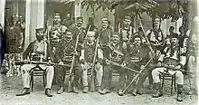 ![]() Dane Stojanović with other commanders in Bitola, 1908. He is seen standing in the centre, with a light hat. | |