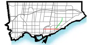 Map of Danforth Avenue (Red) and Danforth Road (Green) within Toronto