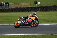 Pedrosa remained with an expanded three-rider Repsol Honda team in 2011, partnering Andrea Dovizioso and Casey Stoner.[15] Pedrosa took podium placings in the opening three races of the season, culminating in a victory at the Portuguese Grand Prix in May.[16] On lap 18 of the following race in France, Pedrosa was involved in an incident with Gresini Racing's Marco Simoncelli while fighting over second place in the race; Simoncelli passed Pedrosa on the outside line into the Chemin aux Boeufs, but pulled in front of Pedrosa and as a result, Pedrosa clipped Simoncelli's rear wheel and fell to the ground.[17] Simoncelli was given a ride-through penalty, while the fall left Pedrosa with a broken collarbone,[18] which ruled him out until July's Italian Grand Prix, where he finished in eighth place.