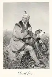 Although Boone reportedly vowed never to return to Kentucky after moving to Missouri, stories (possibly folk tales) were told of him making one last visit to Kentucky to pay off his creditors.[105] American painter John James Audubon claimed to have gone hunting with Boone in Kentucky around 1810. Years later, Audubon painted a portrait of Boone, supposedly from memory, although skeptics noted the similarity of his painting to the well-known portraits by Chester Harding.[106][107] Some historians believe Boone visited his brother Squire near Kentucky in 1810 and have accepted the veracity of Audubon's account.[108][109][note 6]