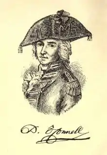 Daniel Charles, Count O'Connell (21 May 1745 – 9 July 1833)[1] was the uncle of Daniel O'Connell "the Liberator." He was from a noble family of Derrynane House, County Kerry, Ireland, but because of the Penal Laws (Ireland) of the time, which forbade a Catholic to have any education or profession, he, like many other ambitious young Irishmen, went to the Continent for an education, and remained abroad. He entered the service of the king of France in the Royal Swedish Regiment (Royal Suédois) in 1761, and in 1769 was transferred to Lord Clare's Regiment of the Irish Brigade (French) and served in Europe and Mauritius until 1778. Then he was appointed Lieutenant-Colonel and transferred back to the Royal Swedish Regiment, with which he saw action at the siege of Port Mahon and at the Great Siege of Gibraltar. "At Gibraltar he was on board one of the famous floating batteries and was severely wounded." He was later appointed Colonel Commander of the Régiment de Salm-Salm, and was created a Chevalier of the Order of Saint Louis. He also was appointed to a military committee charged with revising French infantry tactics.