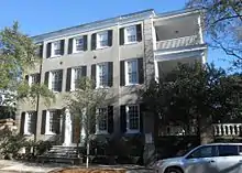 The large double house (i.e., four rooms per floor with a central stair hall) is three stories tall and sits on a high foundation.[1] The exterior has a stucco finish that might have been added following the earthquake of 1886.[1] The three-story piazzas on the south side were added in the 20th century.[3]