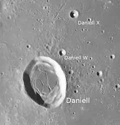 Daniell is a lunar impact crater located in the southern half of the Lacus Somniorum. To the south-southeast is the much larger crater Posidonius. The Rimae Daniell rille system are to the west of Daniell crater.