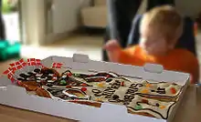 The meal begins with seafood, usually pickled herring, or another herring dish. The cured and pickled herring fillets are typically made and served in a white and a red variety, but a multitude of pickled herring dishes exists.[26][27] White herring has marinated in a clear, sweet and mildly spiced vinegar marinade while the sharper tasting red herring has marinated in a red, seasoned vinegar marinade, owing their red colour to sandal wood.[28] Other common variations includes a variety of sour cream-based sauces, of which a curry flavoured type is very popular. Spegesild is usually served on buttered, black rye bread, topped with onion rings, pickled capers and a glob of curry salad - a sour-cream based sauce, flavored with curry and chopped pickles - and chopped hard boiled eggs on the side. Alternative, but common, herring dishes served at the cold buffet includes stegte sild i eddike (fried herring in vinegar) consisting of rye-battered, fried fillets of herring in a spiced vinegar marinade or the more elaborate silderet (herring dish) where the herring is arranged in a large serving dish with various sides such as warm, boiled potatoes, raw onion, pickled capers and a dill-flavoured sour-cream or mayonnaise sauce, or diced apple, shredded horseradish and curry salad, as two common options.[29][25] Other seafood dishes may include:[30]