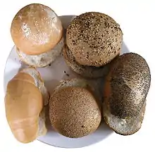 The basic Danish breakfast consists of coffee, or tea, and rye bread, white bread, or rolls with cheese or jam. Bread at breakfast time most often comes in the form of a white loaf known as franskbrød (French bread), a baguette, or a variety of white or brown rolls (boller, birkes, rundstykker, håndværkere) or croissants.[15] The bread is usually buttered and topped with soft or creamy cheese, sausage, pâté, cured cold meat or jam. On festive gatherings or when time permits, as on Sundays, for example, a variety of bread rolls can be included as well as wienerbrød, as Danish pastry is known in Denmark. Fruit juice, mostly orange or apple, and sometimes a bitter such as Gammel Dansk, may also be served, especially when breakfast is served to guests or on special occasions and celebrations like birthdays and anniversaries.[16] In Danish hotels, soft-boiled eggs and cold meats are usually served for breakfast, too.[17]