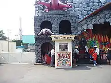 Dante's Inferno was a dark ride created in 1971 by Anton Schwarzkopf that was located at Astroland on Coney Island; a similar ride called Dante's Dungeon is at Morey's Piers at Wildwood, New Jersey.[1] Dante's Inferno is decorated with a purple Cerberus in each tower, a werewolf out of one window, and skeleton warriors in another, its exterior's centerpiece is a large devil holding a victim in his hand that is connecting to the tongue of an upside-down, lolling eyed creature, and a pitchfork in the other. The ride's exterior resembles a castle, and its open area is decorated in graffiti style artwork including Medusa's severed head held by a Grim Reaper, as well as a mad scientist and several dragons.