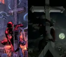 When the look of the film was being decided, Mark Steven Johnson opted to use direct scenes from the Daredevil comics. Joe Quesada's artistic take in Guardian Devil (Daredevil vol. 2, #1–#8) was an influence on the film, with Johnson noting that they would "literally take out a scene from the comic book that Joe did [...] Here's Daredevil on the cross, you know, it's that scene from 'Guardian Devil'. You just shoot that."[8] Throughout the film, Ben Affleck had to wear "cataract milky-blue" contacts, which would effectively make him blind. This was considered great by Johnson, as it would aid his performance.[32]