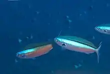 The dark-banded fusilier (Pterocaesio tile), also known as blue-streak fusilier, bluedash fusilier, or neon fusilier, is a species of marine ray-finned fish, a fusilier belonging to the family Caesionidae. It has a wide Indo-West Pacific range. It is of some importance to fisheries within its range.