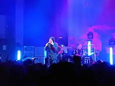 The band were scheduled to begin a tour of the UK and Ireland in January 2006, but were forced to postpone it until February, after guitarist Mikko "Linde" Lindström fractured his wrist after Helldone.[34] At the 2005 Emma Awards, HIM went on to win "Rock Album of the Year", and "Song of the Year" for "Wings of a Butterfly".[35] Dark Light was also nominated for "Album of the Year".[36] On 9 February 2006, HIM began a joint seven-date tour with The Rasmus and Negative across Central Europe, after which HIM continued through Southern Europe, Japan, Australia and New Zealand.[34][37] Also in February 2006, "Killing Loneliness" was released as a single, charting in five countries, peaking at number two in Finland.[21] Two music videos were produced for the song, the latter of which featured a guest appearance by tattoo artist Kat Von D.[38][39] From May to June 2006, HIM toured the US with Aiden acting as support.[40] In August 2006, HIM were nominated by Kerrang! for "Best Band on the Planet".[41] In September 2006, HIM cancelled a forthcoming North American tour, in order to begin work on a new album.[42] "Under the Rose" was also released as the final promotional single from Dark Light in 2006. In October 2007, Ville Valo was awarded at the BMI Pop Award for "Wings of a Butterfly".[43]