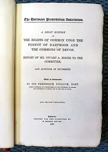 - Moore, Stuart A. "A short history of the rights of common upon the Forest of Dartmoor and the commons of Devon". Dartmoor Preservation Association, Plymouth, 1890. ISBN 0950138649