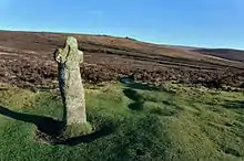 This cross is by the side of the road from Moretonhampstead to Two Bridges, about 900 metres north-west of the Warren House Inn. It was probably erected at this spot for two reasons: as one of the markers of this route long before the road was built, and to mark the boundary between the parishes of Chagford and North Bovey,[5] which runs roughly along the same line as the road. Nothing is known of the early history of the cross, although its crude shape suggests that it is very old. It was later used as a boundary marker for Headland Warren ("WB" carved on one face stands for "Warren Bounds") and as one of the bounds of the mining sett of Vitifer Mine.[6] Its survival here is probably due to its use as a boundary marker: two similar crosses further along the road towards Two Bridges are known to have been removed in the 19th century.[5]
