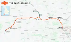 The Dartmoor line is a 15+1⁄2-mile (24.9 km) railway line in Devon, England. From Crediton, the line runs alongside the Tarka Line to the site of the former Coleford Junction where it diverges west to Okehampton. Previously a heritage line, it is owned by Network Rail.[1]