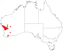 This darwinia grows on sandplains, sometimes on sandstone rock between Kalbarri National Park, Perenjori and Sandstone in the Avon Wheatbelt, Geraldton Sandplains, Mallee, Murchison and Yalgoo biogeographic regions.[2][5][6]