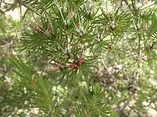 The flowers are arranged in clusters of about four on the ends of the branches, each flower on a stalk 1–2 millimetres (0.04–0.08 in) long. the groups surrounded by reddish bracts 4–13 millimetres (0.2–0.5 in) long. The floral cup is 5–8 millimetres (0.2–0.3 in) long and about 2 millimetres (0.08 in) wide and the petals form a white tube surrounding and enclosing the stamens. The style is white, 14–20 millimetres (0.6–0.8 in) long and extends beyond the end of the flower tube. Flowering occurs between late winter and early summer.[2][3][4]