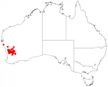Often found on undulating plains and amongst granite outcrops in the Wheatbelt region of Western Australia where it grows in sandy or lateritic soils.[1]