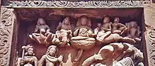 Sculpted panels are seen on the terraced basement, with carved figurines of river goddesses Ganga and Yamuna flanking the doorway to the sanctum sanctorum, standing respectively on their vahanas: crocodile and tortoise.[30] The panels of the stone door have intricate carvings showing amorous couples in different stages of courtship and intimacy. On the facade are two males standing, one holding a flower and the other a garland as if greeting the visitor.[30]