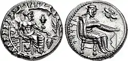 ![]() Coin of Datames. The reverse shows Datames wearing a Persian dress whilst inspecting an arrow, and the observe shows Baal | |