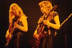 He auditioned for Iron Maiden in late 1976, eager to get back into "a more sort of heavy rock-type vibe."[7] At the time the band already had two guitarists, Dave Sullivan and Terry Rance, who disapproved of Murray being permitted to audition, seeing it as a slight on their ability.[8] The group's founder and bassist Steve Harris did not hesitate to choose Murray over Sullivan and Rance, later stating: "When the others made it plain that it was either them or Dave Murray, there was no choice. There was no way I was gonna let Dave go. Not only was he a nice bloke, he was just the best guitarist I'd ever worked with. He still is."[9] Unfortunately, after only a few months in the band, Murray was sacked following an argument with singer Dennis Wilcock after a show at the Bridge House pub in Canning Town.[10][11]