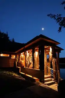 In one of his designs, the Tree House, about one-third of the vertical supports are trees that were originally located on the property. The strength is preserved because they are in full shape without any cuts, usually without stain or bark removal.[16]
