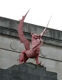 The Mametz Wood memorial commemorates an action of the 38th (Welsh) Division of the British Army during the First Battle of the Somme in 1916. The memorial, located on the site of the action in northern France, is of a large red dragon holding barbed wire, mounted on a stone plinth.[5]