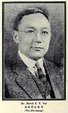 David Z.T. Yui (Chinese: 余日章; pinyin: Yú Rìzhāng; Wade–Giles: Yü Jih-chang; 25 November 1882, in Wuhan – 22 January 1936) was a Chinese Protestant Christian leader who led the Chinese National YMCA. in the 1920s and 1930s.[1]