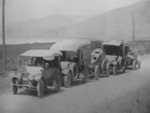 Royal P. Davidson in 1915 commanded a special fleet of eight military vehicles on a convoy from Chicago to San Francisco to evaluate their performance.[6] The vehicles he designed for military use were built by Cadillac.[7] The column included a reconnaissance scout vehicle with instruments for observation, two wireless radio communications vehicles, field cooking vehicle complete with fireless cookers, a hospital vehicle with operating tables and an X-ray machine, a balloon destroyer, a quartermaster's car and the first fully armored military vehicle.[5] War Department personnel representing the government went with the convoy to give reports on the performance of the vehicles.[8] Some of the vehicles had rapid fire machine-guns and searchlights. Five were eight-cylinder vehicles.[9] The Davidson-Cadillac fully armored military vehicle was capable of 70 mph (110 km/h) when the roads allowed.[10] It was America's first military fully armored vehicle.[11]