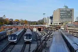 Trains at Davisville yard, seen from Davisville station c. 2009
