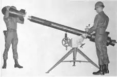 Both weapons fired the same projectile, propelled using a separate cartridge. The smaller M28 used a 5 kg (11 lb) explosive cartridge to launch the warhead. The larger M29 used a 5 kg or an 8.5 kg (19 lb) propellant charge, depending on the desired range.[21] The launcher systems were muzzle loading weapons. As they were intended for a very low rate of fire a breechloading mechanism was unnecessary.[18]