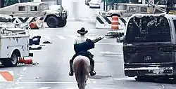 In the seemingly empty city, Rick follows a helicopter flying overhead right into a horde of zombies. They attack him and his horse, killing his horse and forcing him to drop his bag of weapons and crawl under a tank, and as they follow him under it Rick contemplates suicide a split second before noticing a trapdoor to take shelter in the vehicle. After he shoots a walker inside, he hears a voice from the tank's radio sarcastically ask if he is comfortable, before the scene exits with a top down view of Atlanta overrun by walkers.