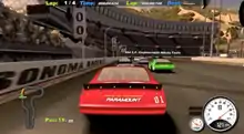 A video game adaptation of the movie from 1990 was announced in 2010, firstly as NASCAR Edition for PlayStation 3 in June and later an Arcade version for Xbox 360 in October.[7][8] In an interview with producer Jeff Dickson, the history behind the game was revealed. The game was created to celebrate the 20th anniversary of the Days of Thunder film. The NASCAR Edition is intended to be a union of NASCAR and the film, and features drivers from the movie as well as NASCAR drivers from the past and present (Hendrick Motorsports was actively involved in the film during 1989 and 1990 filmings, providing cars and technical support; also the film's storyline was based on a former Hendrick driver).[3] Both versions of the game were designed with arcade-based gameplay. During development trailers fictional drivers had liveries coinciding with Paramount Pictures and Days of Thunder, as well as other Paramount Pictures films such as Top Gun, Transformers and Iron Man 2.[9] At release only the Days of Thunder, Paramount Pictures, and other fictional racing liveries/sponsors remained.[10] Michael Rooker returned to voice the character Rowdy Burns in the game.[10]