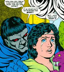 DeSaad's origins were revealed during Darkseid's chess game with Eclipso. After Eclipso told Darkseid of how he had caused the Biblical Great Flood, Darkseid shared how he had corrupted an innocent youth by tricking him into believing the youth's cat had killed his other pet, a bird. Goading the boy to avenge the bird, Darkseid manipulates the youth into burying the cat alive. The bird returned, having flown off, and in a rage, the youth killed the bird and left New Genesis to become Darkseid's lackey.[4]