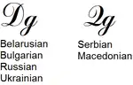 In italic (Russian) type, the lowercase form looks more like the lowercase Latin d, or a numeral "6" flipped horizontally: д. Southern (Serbian, Bulgarian, Macedonian) typography may prefer a variant that looks like a lowercase Latin g. Cursive lowercase De has the same two shapes, but with a different distribution: for example, the g-shaped variant is a standard for Russian schools.[1]