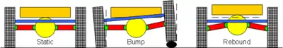 de Dion suspension characteristics: Camber change on one sided bumps, none on rebound. The de Dion tube is shown in blue. The differential (yellow) is connected directly to the chassis (orange).