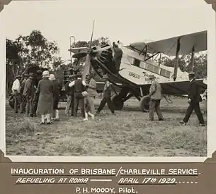 | The arrival of QANTAS DH.61 'Apollo,' bringing the first air mail to Brisbane on 23 April 1929. Notice the pilot's open cockpit behind the wings. | |