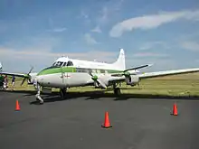 The de Havilland DH.114 Heron is a small propeller-driven British airliner that first flew on 10 May 1950. It was a development of the twin-engine de Havilland Dove, with a stretched fuselage and two more engines. It was designed as a rugged, conventional low-wing monoplane with tricycle undercarriage that could be used on regional and commuter routes. A total of 149 were built,[1] and it was also exported to about 30 countries. Herons later formed the basis for various conversions, such as the Riley Turbo Skyliner and the Saunders ST-27 and ST-28.