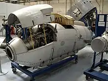For simplicity, there were no fuel pumps and the tanks were pressurised by nitrogen from nine cylinders wrapped around the combustion chamber.[4] The Super Sprite was packaged as a self-contained engine in its own nacelle, jettisoned after take-off and retrieved by parachute. Inflatable air bags cushioned its impact with the ground. To obtain a clean separation from the carrier aircraft, the production engines fitted to the Vickers Valiant had a small canard vane at the nose, pitching the nacelle downwards on separation.
