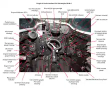 Preparing the Vampire for take-off required pilots to perform only six 'vital actions': setting the trim to neutral, opening the high and low-pressure fuel cocks, activating the booster pump, setting the flaps, and retracting the air brakes.[34] If laden with external fuel tanks or bombs, pilots would have to retract the undercarriage quite quickly upon leaving the ground, else increasing airflow as the aircraft picked up speed would prevent the undercarriage doors from closing.[35] Landing procedure was similarly free of complexity: disengaging the wheel brakes, lowering the undercarriage, setting the flaps to fully down, and activating the air brakes. Typically, power-on landings were conducted due to the slow response of the engine to throttle changes, and wheel brakes had to be applied carefully to avoid locking the wheels because there was no anti-lock braking system on the fighters.[30] Training variants had the Dunlop Maxaret anti-skid system fitted.