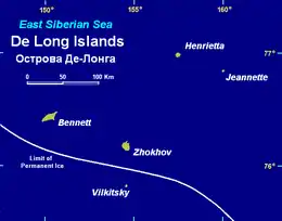 Some US individuals assert American ownership of Jeannette, Henrietta and Bennet Islands in the De Long group.[10][11] This assertion is not supported by the US government.[11][12] Following their discovery in 1881, De Long claimed these islands for the U.S.[13] and reported to the United States Department of the Navy that a party had landed on Henrietta Island and taken possession.[14] During 1916 the Russian ambassador in London issued an official notice to the effect that the Imperial government considered these islands were integral parts of the Russian Empire. This territorial claim was later maintained by the Soviet Union. A resolution of the Alaska State Senate in 1988 supported an American claim to the islands, but during 1994 the Alaska State Supreme Court ruled in D. Denardo v. State of Alaska that Bennett Island, along with several other islands, is not part of Alaska.[15] The United States Department of State has asserted that claim has never been made by the United States to any of the islands, and the US recognizes it as Russian territory.[12]
