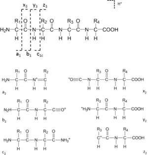 Further cleavage happens under high-energy CID at the side chain of C-terminal residues, forming dn, vn, wn-ions.[8]