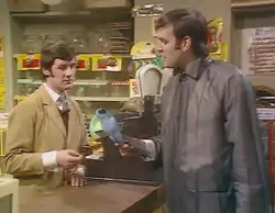 As the exasperated Praline attempts to wake up the parrot, the shopkeeper tries to make the bird move by hitting the cage, and Praline erupts into a rage after banging "Polly Parrot" on the counter. After listing several euphemisms for death ("is no more", "has ceased to be", "bereft of life, it rests in peace", and "this is an ex-parrot") he is told to go to the pet shop run by the shopkeeper's brother in Bolton for a refund. That proves difficult, as the proprietor of that store (who is really the shopkeeper, save for a fake moustache) claims this is Ipswich, whereas the railway station attendant (Terry Jones) claims he is actually in Bolton after all.[4]