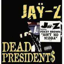 "Dead Presidents" is a 1996 song by American rapper Jay-Z. It was released as the first promotional single for Jay-Z's debut album Reasonable Doubt, though it did not directly appear on the album: a different version of the song with the same backing track and chorus but with different lyrics called "Dead Presidents II" appeared on Reasonable Doubt. "Dead Presidents II" was voted number 16 in About.com's Top 100 Rap Songs[2] and number two in Rolling Stone's Top 50 Jay-Z Songs.[3]