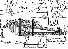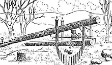 Yes, boys, the deadfall is a splendid trap if made right, says an Arkansas trapper. I will tell you how to make one that will catch every mink and coon that runs the creek. Take a pole four feet long and four inches through, next get a log six inches through and eight feet long. Use eight stakes and two switches. Use the figure four trigger, but the notches are cut different. Both of the notches are cut on the top side of the long trigger and a notch cut in the upright trigger and down the long trigger. The paddle part is sixteen inches long. When the trap is set the paddle wants to be level and one-half inch higher than small logs, then your two switches comes in this to keep the paddle from hitting the bark on side logs. [2]
