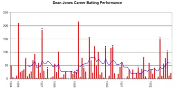 Jones began his first-class career in the 1981–82 season with Victoria in the Sheffield Shield. Jones also played for Durham and Derbyshire in the English County Championship.[2] Jones captained Derbyshire to second place in the 1996 County Championship, their best finish for 60 years. Jones scored 1,338 runs in the season, more than any other Derbyshire player.[3][4] He left Derbyshire mid-season in 1997 after disagreements with team mates.[3][4] Jones also had run-ins with authority and teammates in his home state of Victoria.[5] During his career, he scored 19,188 runs in first-class matches, including 55 centuries and 88 half centuries and a highest score of 324 not out, at an average of 51.85.[6]