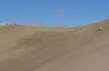 The hot, dry climate makes it difficult for soil to form. Mass wasting, the down-slope movement of loose rock, is therefore the dominant erosive force in mountainous areas, resulting in "skeletonized" ranges (mountains with very little soil on them). Sand dunes in the park, while famous, are not nearly as widespread as their fame or the dryness of the area may suggest. The Mesquite Flat dune field is the most easily accessible from the paved road just east of Stovepipe Wells in the north-central part of the valley and is primarily made of quartz sand. Another dune field is just 10 miles (16 km) to the north but is instead mostly composed of travertine sand.[23] The highest dunes in the park, and some of the highest in North America, are located in the Eureka Valley about 50 miles (80 km) to the north of Stovepipe Wells, while the Panamint Valley dunes and the Saline Valley dunes are located west and northwest of the town, respectively. The Ibex dune field is near the seldom-visited Ibex Hill in the southernmost part of the park, just south of the Saratoga Springs marshland. All the latter four dune fields are accessible only via unpaved roads. Prevailing winds in the winter come from the north, and prevailing winds in the summer come from the south. Thus, the overall position of the dune fields remains more or less fixed.