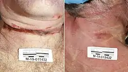 According to Baden, the neck wound was in the center of Epstein's neck, not under his mandibles as in a typical hanging. Baden said this is more common when a victim is strangled by a wire or cord. Baden also said that the wound was much thinner than the strip of bedsheet, and although there was blood on Epstein's neck, it was absent on the bed-sheet ligature.[25] In response to Baden's claims, Sampson stood by the conclusion that Epstein's death was suicide.[55]