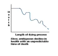 Death trajectory refers to the pattern[1] of dying when a patient is given a projected death date with limited or no medical recourse for the remaining existence of the individual's life.[2] The death trajectory is dependent on the cause of death, whether it is sudden death, chronic illness, or the steady decline in health due to senescence (aging).[3] Death trajectory is analyzed in two separate aspects: duration and shape. Duration refers to the period of time a patient has to live, which can be anywhere from imminent death to several months.[2] Shape refers to how that duration is then graphed. In other words, the shape is "the course of dying, its predictability, and whether death is expected or unexpected".[2]