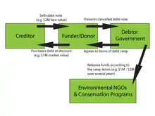 Bilateral debt-for-nature swaps take place between two governments. In a bilateral swap, a creditor country forgives a portion of the public bilateral debt of a debtor nation in exchange for environmental commitments from that country.[3] An example of a bilateral swap occurred when the U.S. Government, under the Enterprise for the Americas Initiative, forgave a portion of Jamaica's official debt obligations and allowed the payments on the balance to go into national funds that finance environmental conservation. These funds established the Environmental Foundation of Jamaica in 1993. Multilateral debt-for-nature swaps are similar to bilateral swaps but involve international transactions of more than two national governments. Recorded bilateral and multilateral debt-for-nature swaps have generated nearly US$900 million in total conservation funding from 1987-2010 (see Table 1).[4] A closely related form of debt swap is a debt-for-efficiency swap.[6]
