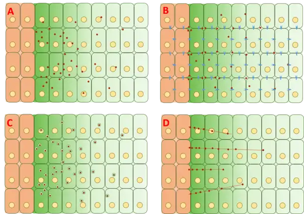 The free diffusion model assumes Dpp to diffuse freely through the extracellular matrix, degrading via receptor-mediated degradation events. FRAP assays have argued against this model by noting that diffusion of GFP-Dpp does not match that expected of a similarly sized molecule.[20] However, others have argued that a rate-limiting slow step further downstream of the process such as slow immobilization and/or slow degradation of Dpp itself could account for the observed differences in diffusion.[22] Single molecules of Dpp have been tracked using fluorescence correlation spectroscopy (FCS), showing that 65% of Dpp molecules diffuse rapidly (consistent with the free diffusion model) and 35% diffuse slowly (consistent with Dpp bound to receptors or glypicans).