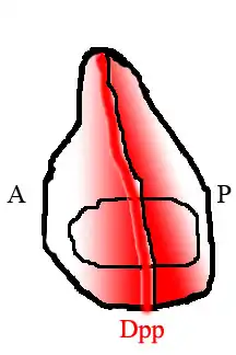 Dpp is a classic morphogen, which means that it is present in a spatial concentration gradient in the tissues where it is found, and its presence as a gradient gives it functional meaning in how it affects development. The most studied tissues in which Dpp is found are the early embryo and the imaginal wing discs, which later form the wings of the fly. During embryonic development, Dpp is uniformly expressed at the dorsal side of the embryo, establishing a sharp concentration gradient.[2] In the imaginal discs, Dpp is strongly expressed in a narrow stripe of cells down the middle of the disc where the tissue marks the border between the anterior and posterior sides. Dpp diffuses from this stripe towards the edges of the tissue, forming a gradient as expected of a morphogen. However, although cells in the Dpp domain in the embryo do not proliferate, cells in the imaginal wing disc proliferate heavily, causing tissue growth.[1] Although gradient formation in the early embryo is well understood, how the Dpp morphogen gradient forms in the wing imaginal disc remains controversial.